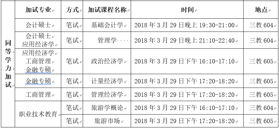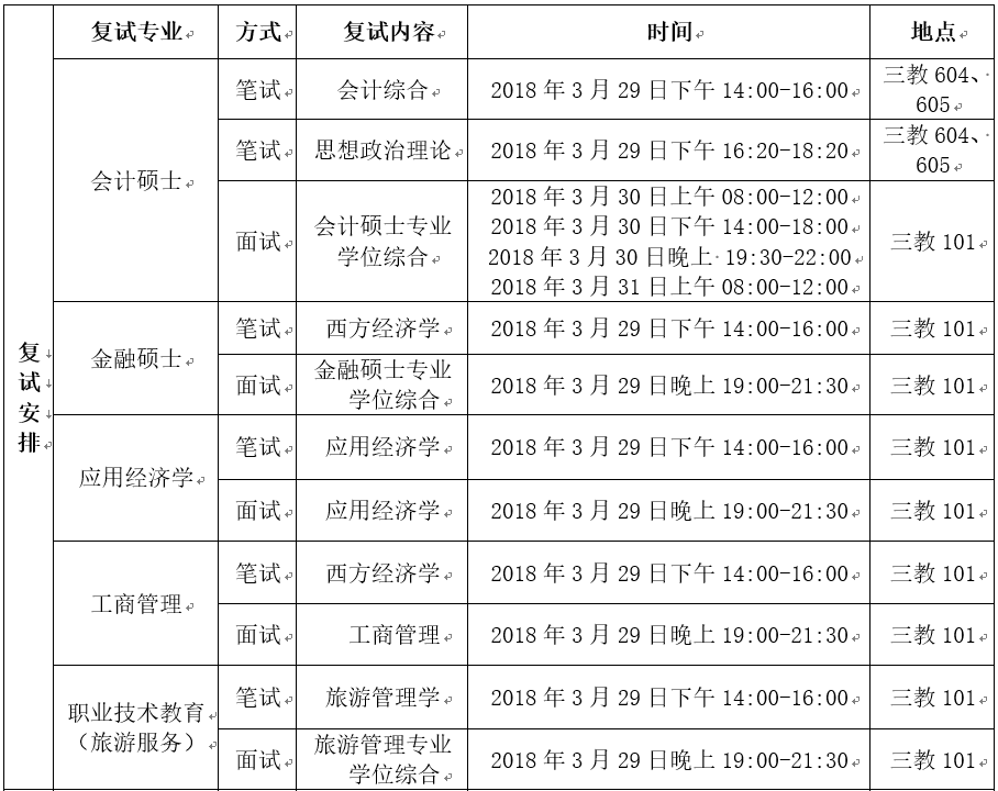2018年,学校下达我院学术型研究生招生指标31人、专业学位研究生招生指标78人。经我院复试录取工作领导小组决定,应用经济学计划录取20人,工商管理计划录取11人,学术型研究生录取人数根据各专业复试情况内部调节;会计硕士专业学位计划录取61人(全日制30人,非全日制30人,士兵专项1人)、金融硕士专业学位计划录取11人(全日制)、教育硕士专业学位计划录取6人(全日制)