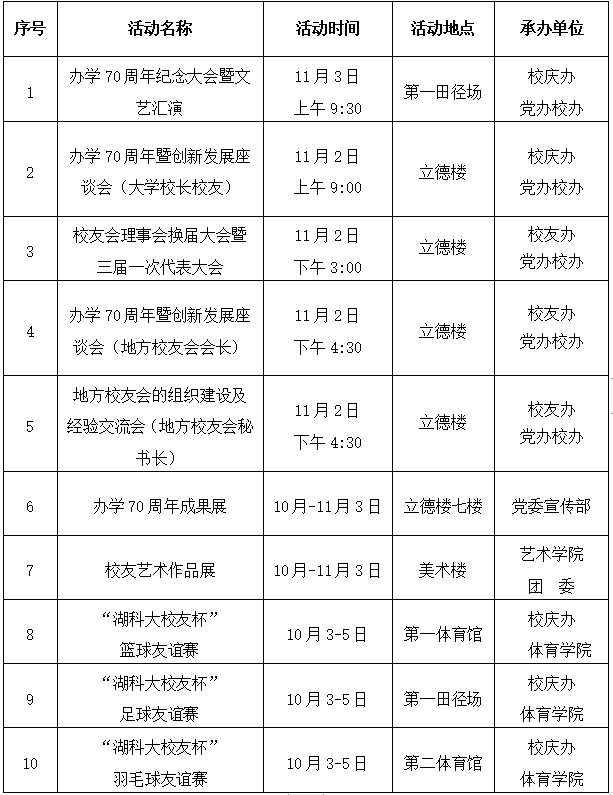 自70周年校庆筹备工作正式启动以来,学校坚持以“思源致远 聚力奋进”为主题,本着热烈、简朴的原则,开展了系列校庆活动,在校内外产生了广泛影响。为了进一步回顾办学历程,总结办学经验,展示办学成就,谋划未来发展,献礼祖国华诞,学校将继续举办纪念办学70周年活动。根据上级文件要求,学校对校庆部分主要活动时间进行调整,将于2019年11月3日上午举办“湖南科技大学办学70周年纪念大会暨文艺汇演”。现将校庆期间主要活动、教学院联系方式和校庆捐赠有关事宜公告如下。