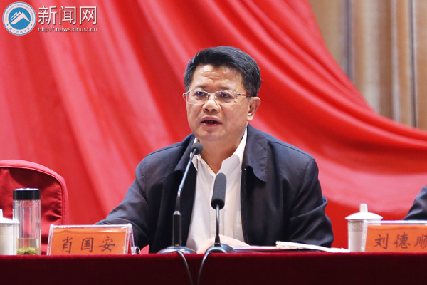 肖国安要求,要齐心协力促进“双一流”大学建设。习近平总书记在2014年教师节考察北京师范大学期间首次提出要高校要进行“双一流”大学建设,这是党中央、国务院审时度势,根据中国经济社会发展的历史阶段,着眼于实现中华民族伟大复兴的中国梦而做出的科学判断和战略决策。肖国安指出,世界高等教育的发展存在两条规律,即“一流强国与一流大学相辅相成、共生共荣”,“强国的演进轨迹与世界一流大学中心转变的轨迹是基本吻合的”,因此,建设“双一流”大学是进一步促进我国经济社会进一步发展的必要途径。学校要以建设“双一流”大学为目标,始终坚持以立德树人为根本,坚持德育为先,培养一流人才,注重大学文化建设;坚持以队伍建设为关键,充分发挥学科领军人才的引领作用,建设高素质创新团队,大力培养中青年人才,营造良好的学术生态环境;坚持学科建设为重点,着力凝练学科优势特色,创新学科组织模式;坚持科技创新为导向,努力提升科学研究水平,推进科研成果转化,传承创新优秀文化;坚持综合改革为动力,完善内部治理结构,深化关键环节改革,推进开放办学。在具体工作思路上要做到突出重点,兼顾一般;分类发展,争创一流;分步推进,整体提升;崇尚科学,服务发展;整合资源,集中力量;注重实效,动态调整。