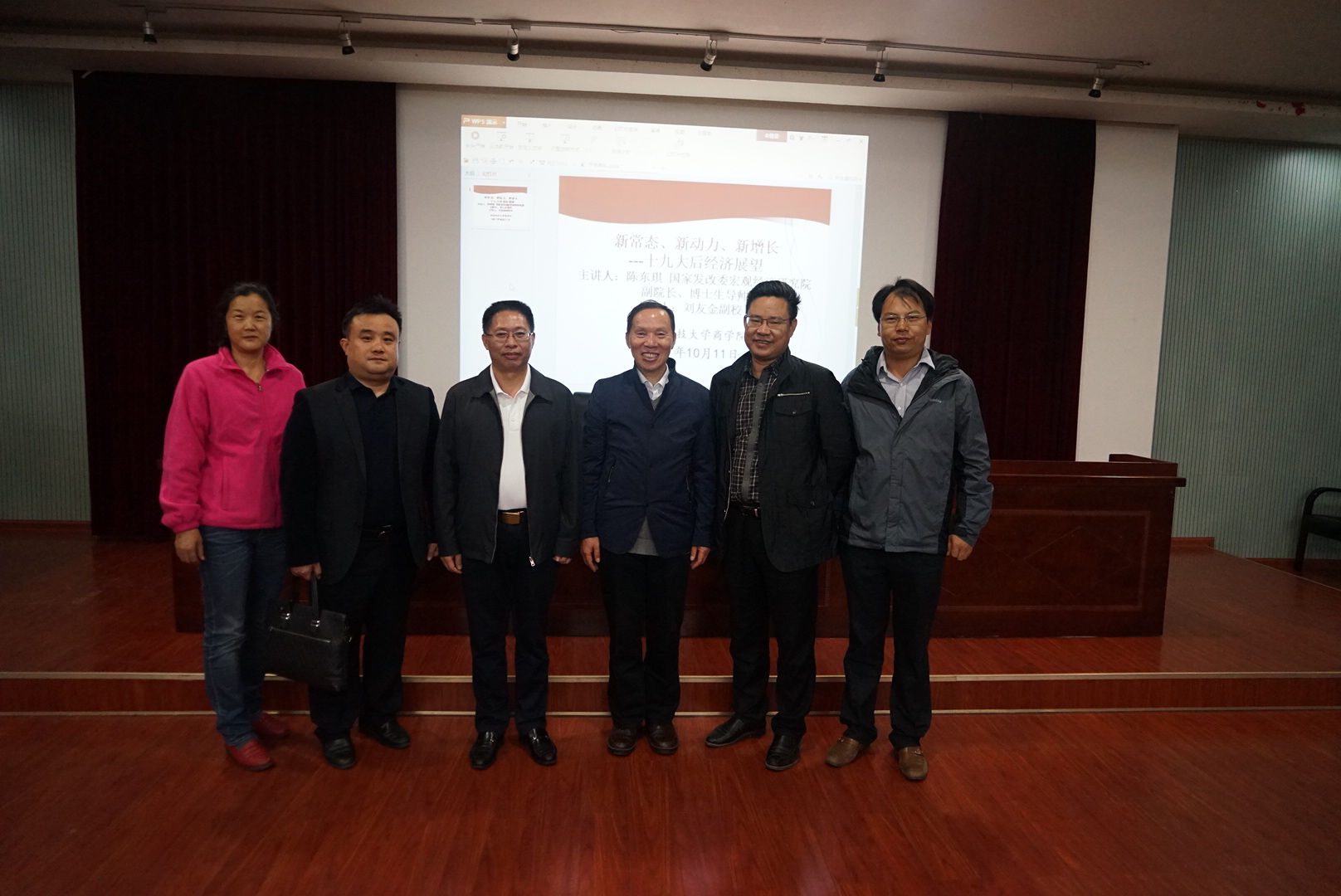 10月11日晚七点半,由国家发改委宏观经济研究院陈东琪教授主讲的“新常态,新动力,新增长——十九大后经济展望”学术讲座在三教101准时开始。会议由刘友金副校长主持,校社科处处长向国成教授,金沙js1005线路潘爱民书记、贺胜兵副院长、颜剩勇副院长及多位老师参与了讲座。