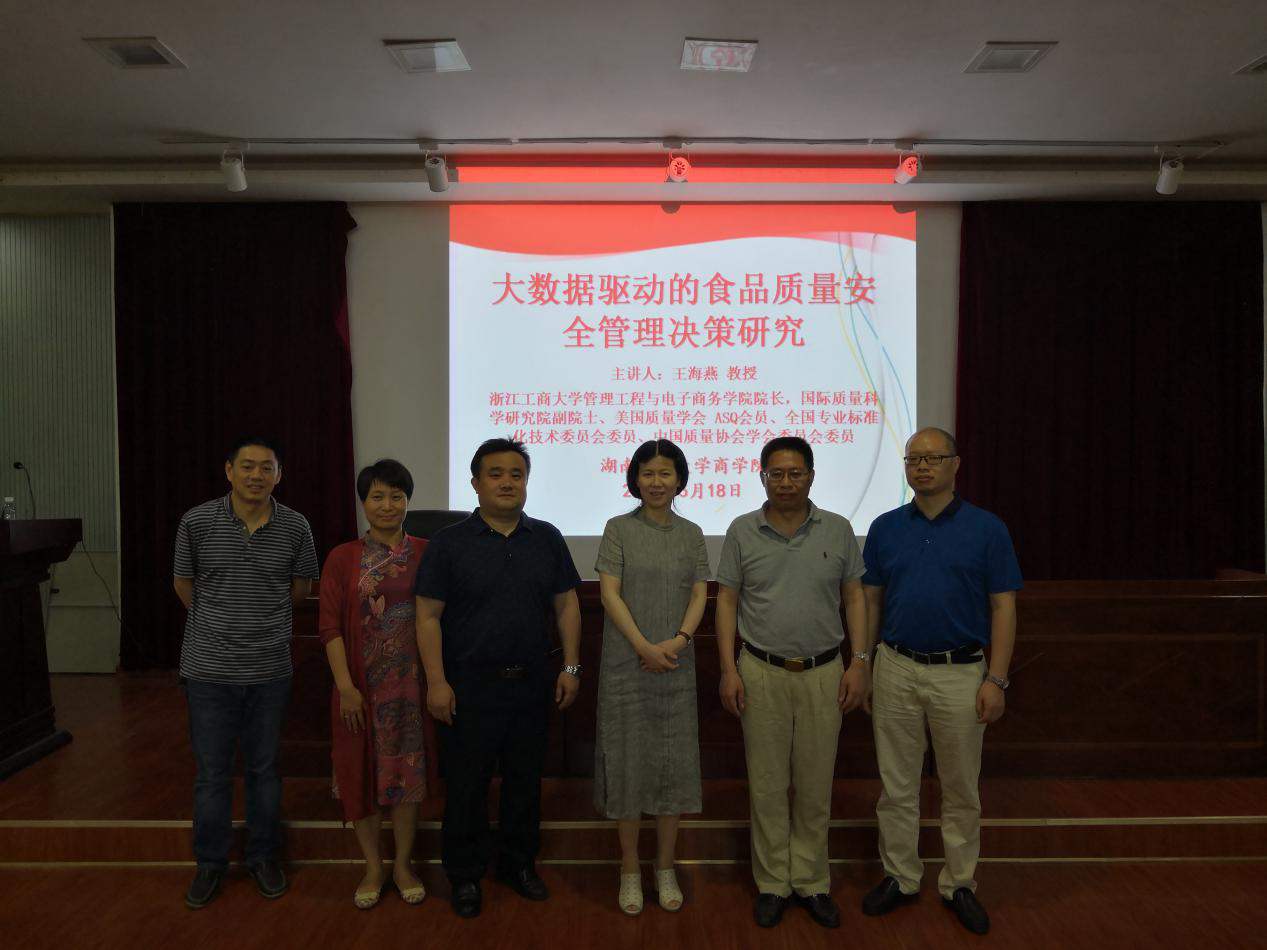 2018年5月18日下午2:30,金沙js1005线路立言讲坛第一百三十讲“大数据驱动的食品质量安全管理决策研究”于三教101学术报告厅举行。本次讲座由浙江工商大学管理工程与电子商务学院院长王海燕教授担任主讲,湖南科技大学副校长刘友金教授主持。王教授是国际质量科学研究院副院士、美国质量学会 ASQ会员、全国专业标准化技术委员会委员、中国质量协会学会委员会委员。金沙js1005线路党委书记潘爱民教授、我院部分教师及研究生参加了本次讲座。