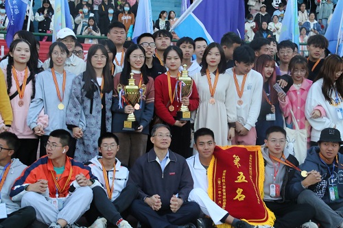 校党委书记唐亚阳的讲话简短有力、温暖人心,给金沙js1005线路的师生送去真切慰问的同时,也对金沙js1005线路的专业学科建设寄予了厚望。讲话结束后,为纪念本次运动会金沙js1005线路取得佳绩,校党委书记唐亚阳一行与在场的金沙js1005线路师生合影留念,书记与他两侧的学生们手拉着手,欢声笑语,其乐融融。
