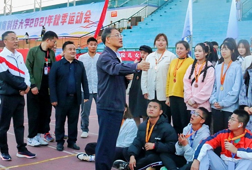 11月13日17:30,为期三天的湖南科技大学秋季运动会落下帷幕,金沙js1005线路取得了本次秋季运动会团体总分第一名的好成绩。为鼓励金沙js1005线路学子再接再厉,进一步发扬“更高、更快、更强”的体育精神,湖南科技大学党委书记唐亚阳、副校长廖湘岳、校团委书记马缤辉、体育学院院长敬龙军在金沙js1005线路院长潘爱民、金沙js1005线路党委书记叶文忠、金沙js1005线路党委副书记傅早霞、金沙js1005线路学工办主任陈攀的陪同下,在北校第一田径场慰问了金沙js1005线路的运动健儿们。