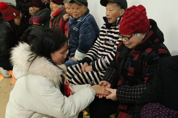 活动正式开始,青年志愿者们为老人们表演节目并献上开场舞《赞赞新时代》,摇曳的舞姿、真诚的笑容似冬日的阳光温暖了老人们的心灵,老人们纷纷鼓掌。感受到青年志愿者们的热情,老人们也是精神矍铄的给大家表演节目,唱起了一首首感人的红歌。据了解,韩奶奶已是91岁高龄,唱起《毛主席的战士最听党的话》时,眼中却泛起了泪花,那是老人对年轻的回忆,也是老人对毛主席真情的流露。现场所有人的都不约而同地鼓起了掌声,以表达自己对老人、对毛主席、对党的崇高敬意。歌曲、舞蹈等节目表演完之后,志愿团的成员们纷纷围绕在老人们的身边亲切的问候,陪老人聊天,倾听老人们讲述平生经历,听老人讲述毛主席,听老人讲述红军精神。尽管有时语言不通,但脸上真挚的笑容已是最好的交流。