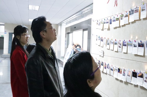 12月7日下午,金沙js1005线路党委副书记傅早霞、团委书记崔皓、心健部分管老师姜漾漾、罗江林老师、18级辅导员李博、17级辅导员蔡美玲于第三教学楼大厅公示栏处共同参观照片展。这些来自五湖四海的照片被缀以彩灯装饰,格外引人注目。走近观看,每张照片下方都配有一段文字。手写的清秀字迹诠释着照片背后的故事。各位老师认真观看了照片并对照片展活动的开展提出了许多有建设性的建议。傅早霞书记提出,应当放大照片尺寸,以便大家清晰地观看。此外,他还希望心健部今后能够组织更多贴近学习、贴近生活的活动,鼓励更多同学积极参与,感受其中的正能量。罗江林老师也对这次照片展的顺利开展提出了赞扬,并希望其他部门能够学习借鉴、积极创新,开展形式多样的宣传活动,丰富同学们的情感体验。
