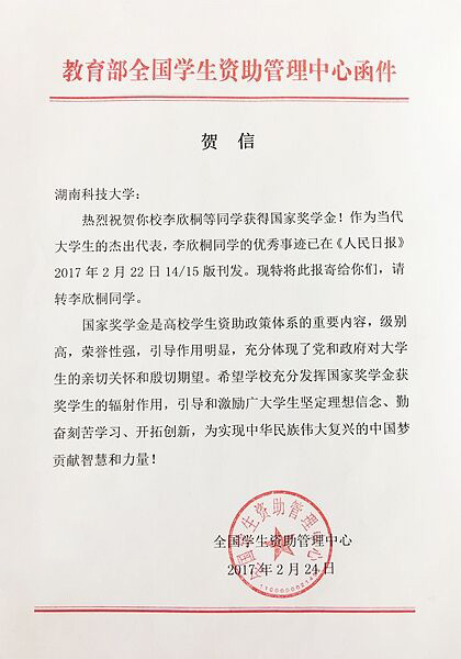 国家奖学金是为激励各高校学生勤奋学习、努力进取,在德、智、体、美等方面全面发展,由中央政府出资设立的奖励特别优秀学生的奖学金。每年经过严格选拔、评审,会有约5万名优秀大学生荣获该项奖金。其中,经各省、各高校推荐和专家评审,今年有108位学生代表的优秀事迹刊登在《人民日报》,我校校友李欣桐荣膺该名录。