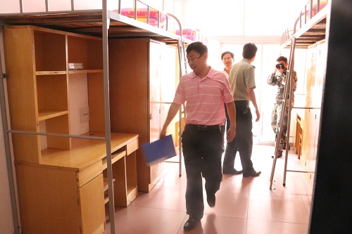 根据湖南科技大学2019级新生军训工作安排,9月16日上午10:00,湖南科技大学学工处处长尹风雨、保卫处处长朱理哲、后勤处处长龚彩、保卫处副处长沈智祥和朱才亮、金沙js1005线路党委副书记傅早霞、学工办主任陈攀、保卫处秦奕和元曲及19级金沙js1005线路辅导员前往八区新生宿舍,实地检查学生内务整理情况,督促新生保持良好的内务秩序。尹风雨、朱理哲、龚彩为本次内务检查评比的评委。