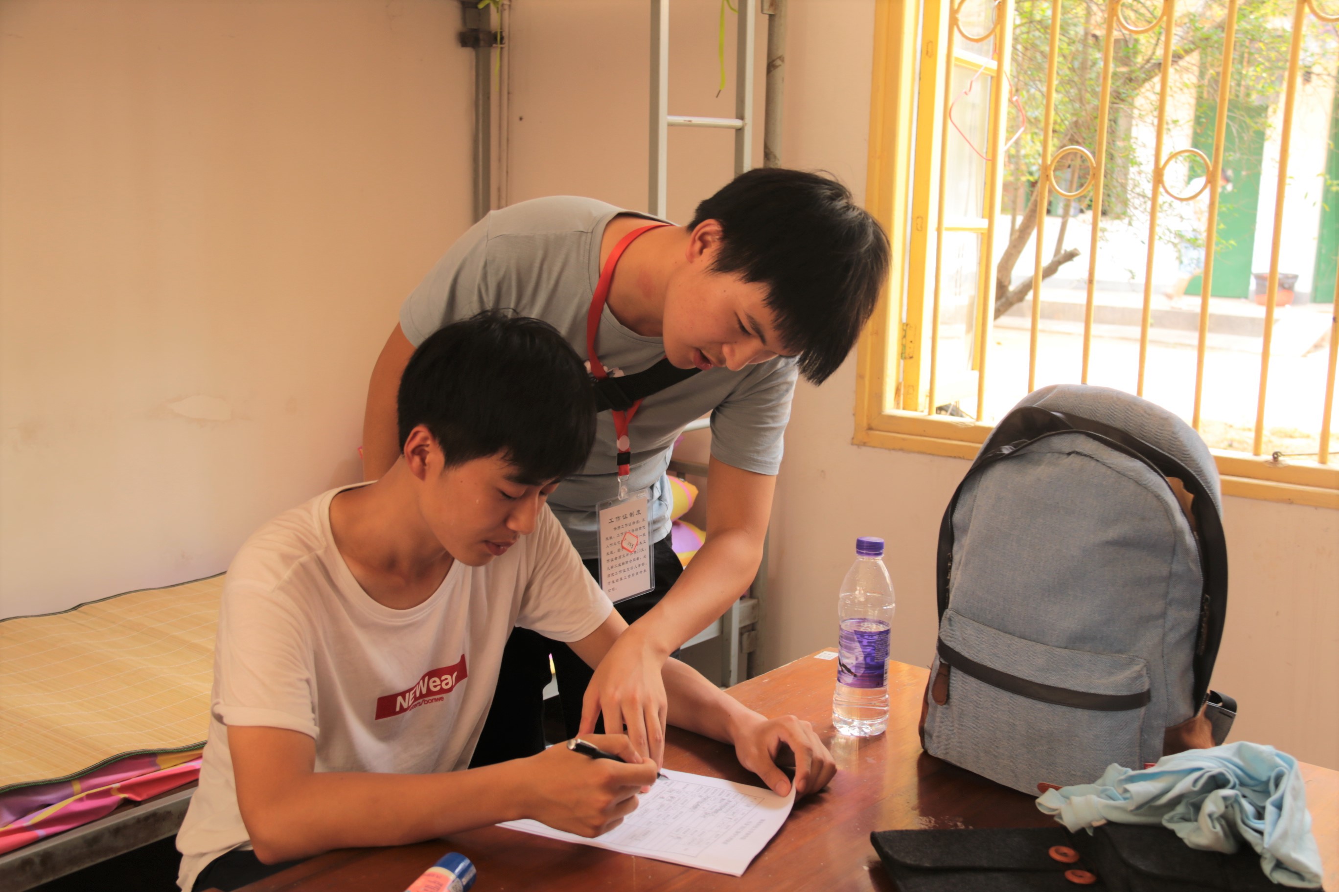 许多志愿者积极和新生联系,保证顺利接到新生把他们带到自己的宿舍。各班的新生助理班主任也在人群中穿梭,为的是找到新生分发钥匙并提醒一些注意事项。值班点的工作人员正积极为新生和家长解疑答惑,指引方向。宿舍区一片热闹氛围。