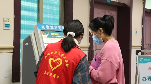 14:40,在护士的安排下,志愿者们被分配到了不同的岗位上,有的负责为患者引导科室位置,有的负责在门诊大厅维持秩序,还有的负责帮助患者及其家属操作自助服务机。在护士向志愿者们介绍了自助机器的操作流程后,志愿者们使用起来也更加得心应手,成功帮助患者们完成挂号或缴费流程。看到没戴好口罩、排队间距过近的患者,在一旁的志愿者李咪立马上前提醒。在不断的学习和实践中,志愿者们的应变能力也随之提高,能够更加从容地面对新的问题和状况。