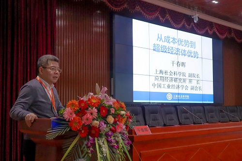 上海社会科学院副院长干春晖教授以《利用超级经济体优势,实现中国经济转型升级》为题,着重介绍了四个方面的内容,即正在消失的成本优势、崛起中的规模、超级经济体的六大优势、异质性/梯度等。
