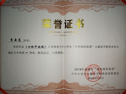 ——李岳龙获2019年湖南省“我和我的祖国”大中小学生主题读书教育活动征文大赛一等奖