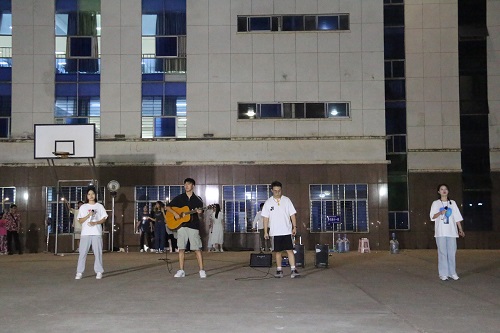 时间转瞬即逝,演出即将步入尾声。“故事的小黄花,从出生的那年就飘着,童年的荡秋千,随记忆一直晃到现在……”,文娱部为现场观众带来了一曲《晴天》。其浪漫轻快的节奏,柔和流畅的旋律,为严酷的军训生活增添了一丝柔情和浪漫,也仿佛让燥热的空气得到了缓解。此刻,现场众人仿佛心间颤起涟漪,纷纷打开手机闪光灯,悠悠地随着节拍左右摇晃,伴着吉他声低唱,场面温柔而和谐。