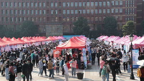阳光灿烂,月湖广场上搭建着几百顶红色帐篷。湖南科技大学各个学院的服务点坐满了人,静候各专业班级前来签到的同学。已经毕业的校友来到了招聘现场进行招生。九点刚过,商学院党委副书记傅早霞询问就业服务部成员:“签到的同学有多少?”成员回答:“时间还比较早,前来签到的学生不多。”正在签到的学生看见副书记,笑着打招呼:“书记好!”