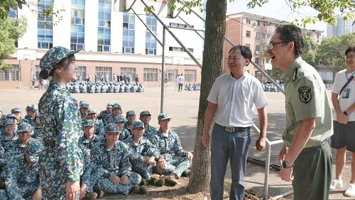 老师们先是依次来到各排进行慰问,各排教官有序组织新生们向各位老师问好,“祝老师节日快乐!”训练场上回荡着大家的洪亮有力的问候声。而回应这充满热情的问候的是贺胜兵书记和傅早霞副书记的温情关怀与祝福:“同学们训练辛苦了!节日快乐!”
